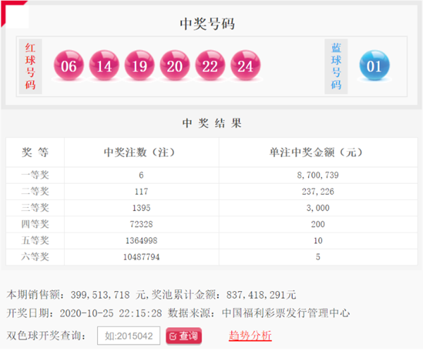 10月25日晚,中国福利彩票双色球游戏进行第2020105期开奖。当期双色球红球号码为06、14、19、20、22、24,蓝球号码为01。