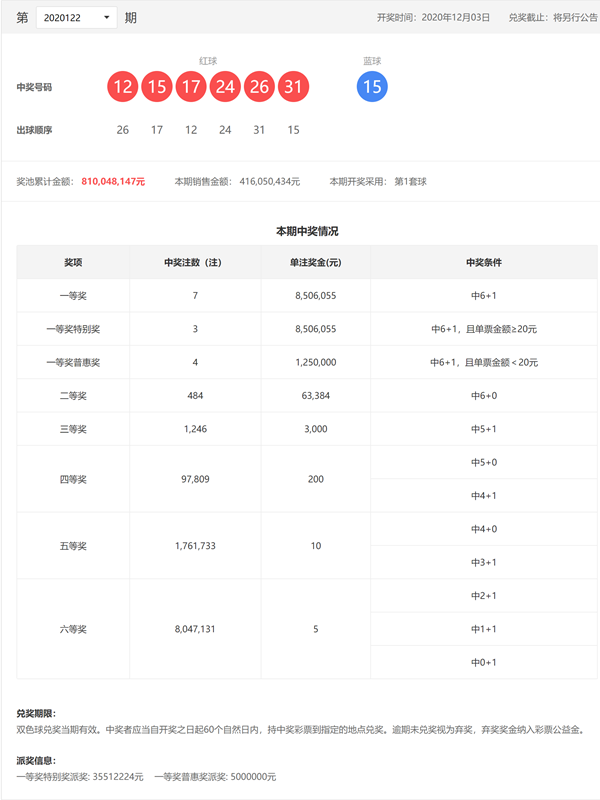 奖池8.1亿多元 下期一等奖特别奖派3551万多元