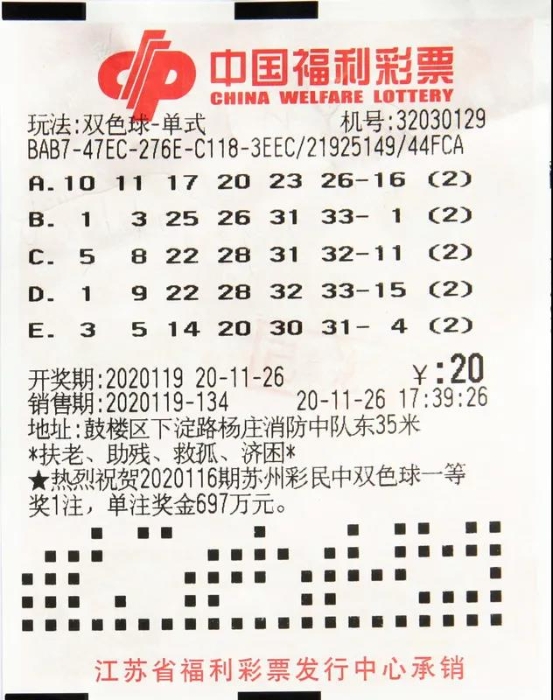 江苏省喜中2注双色球游戏一等奖,分别来自于徐州市和苏州市。其中,徐州的幸运站点是徐州市鼓楼区下淀路杨庄消防中队东35米、编号32030129的福彩投注站,销售时间为11月26日17时39分26秒,幸运彩民对之前的一张2倍倍投的5注单式票进行了复制,花费了20元,其中的第4注号码与当期的中奖号码完全一致,总计中得一等奖2注,单注奖金688万多元,由于正处于双色球12亿元大派奖期间,根据派奖规则,另收获2注一等奖特别奖,单注奖金428万多元,奖金总额为2233万多元。?