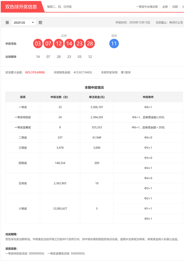 奖池8.23亿多元 下期一等奖特别奖派3000万元