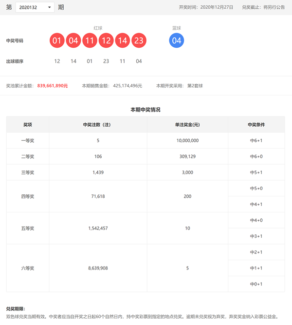 12月27日晚,中国福利彩票双色球游戏进行第2020132期开奖。当期双色球红球号码为01、04、11、12、14、23,蓝球号码为04。