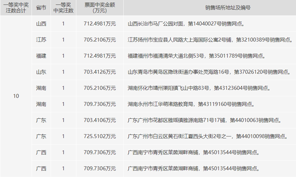 当期双色球头奖10注,单注奖金为703万多元。这10注一等奖花落7地,山西1注,江苏1注,福建1注,山东1注,湖南2注,广东2注,广西2注,共10注。
