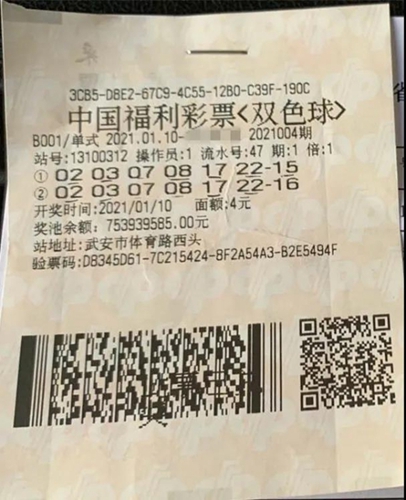 1月10日,双色球2021004期,武安市体育路西头银泉小区对过13100312站一位彩民凭借一张4元2注单式票,中一等奖1注、二等奖1注,