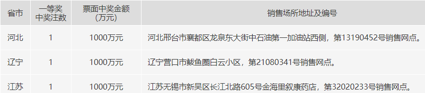 当期双色球头奖3注,单注奖金为1000万元。这3注一等奖花落3地,河北1注,辽宁1注,江苏1注,共3注。