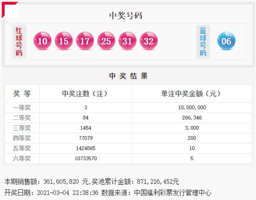 3月4日晚,中国福利彩票双色球游戏进行第2021022期开奖。当期双色球红球号码为10、15、17、25、31、32,蓝球号码为06。