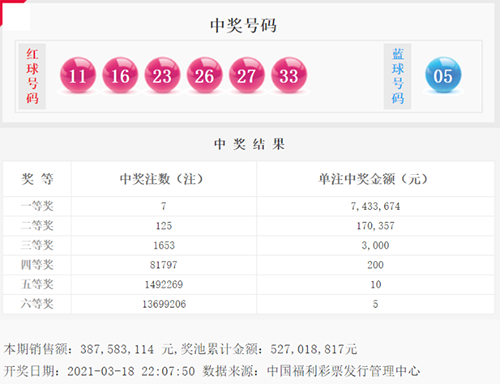 3月18日晚,中国福利彩票双色球游戏进行第2021028期开奖。当期双色球红球号码为11、16、23、26、27、33,蓝球号码为05。