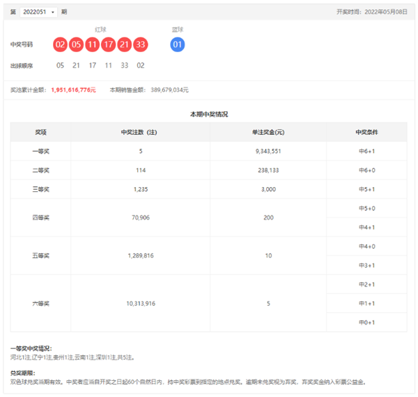 5月8日晚,中国福利彩票双色球游戏进行第2022051期开奖。当期双色球红球号码为02、05、11、17、21、33,蓝球号码为01。