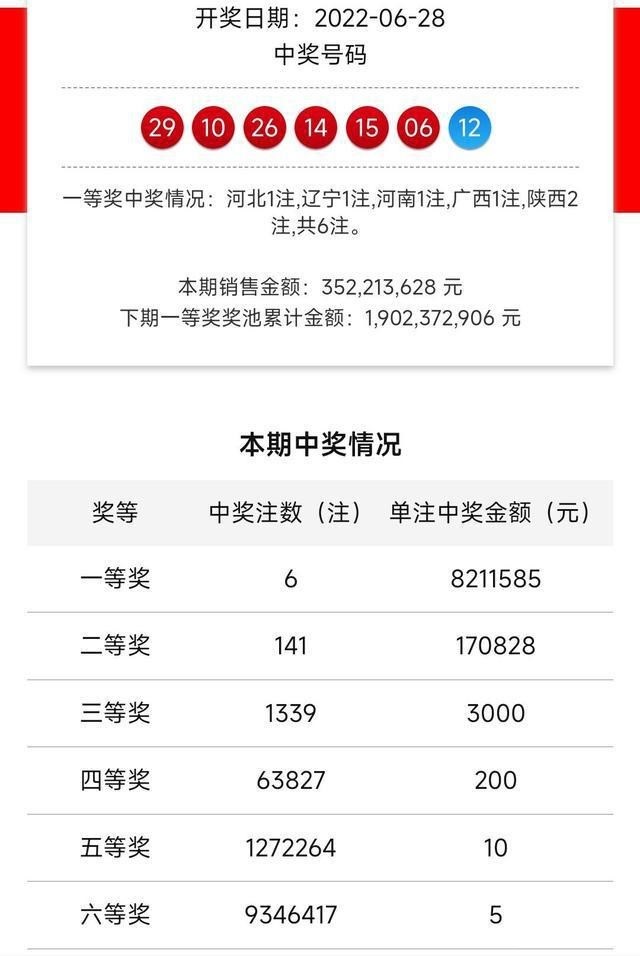 在6月28号星期二晚,福彩双色球游戏第22073期开奖结果进行了公布,本期开奖号码为红球:06、10、14、15、26、29,蓝球:12。