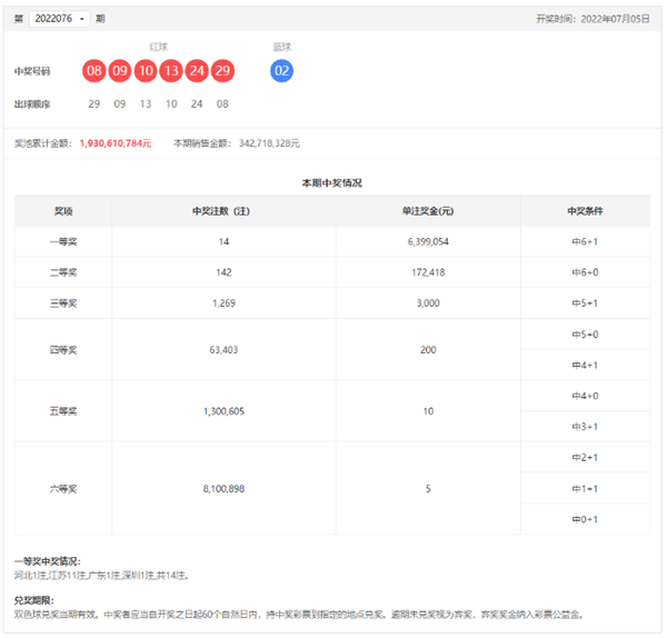 7月5日晚,中国福利彩票双色球游戏进行第2022076期开奖。当期双色球红球号码为08、09、10、13、24、29,蓝球号码为02。