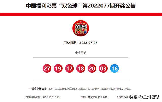 7月7日晚,中国福利彩票双色球游戏进行第2022077期开奖。本期双色球红球号码为03、17、18、19、20、27,蓝球号码为16。