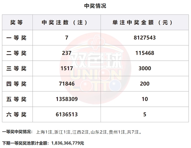当期全国一等奖开出7注,单注奖金812.75万元,被上海、浙江、江西(2注)、山东(2注)和贵州的彩民分享。二等奖开出237注,单注奖金11.54万元。当期销售额3.52亿元,下期一等奖奖池累计金额18.36亿元,仍旧保持在高位运行!