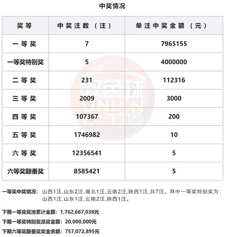 当期全国一等奖开出7注,单注奖金796.51万元,被山西、山东(2注)、湖北、云南(2注)和陕西的彩民分享。其中,一等奖特别奖开出5注,单注奖金400万元,被山西、山东、云南(2注)和陕西的彩民分享。二等奖开出231注,单注奖金11.23万元。当期销售额4.29亿元,下期一等奖奖池累计金额17.62亿元,仍旧保持在高位运行!