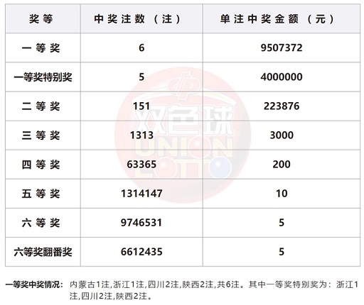 本期一等奖中出6注,单注奖金950万元,其中一等奖特别奖5注,单注派奖奖金400万元。