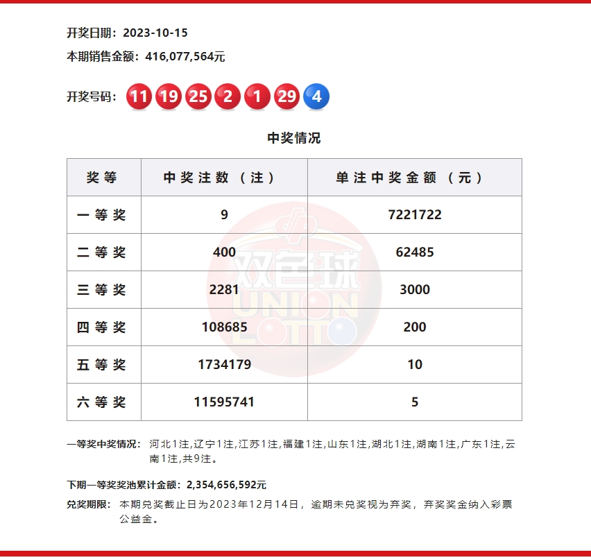 当期全国销量为4.16亿多元。计奖后,双色球奖池金额为23.54亿多元。下期,彩民依然有机会2元中得1000万。