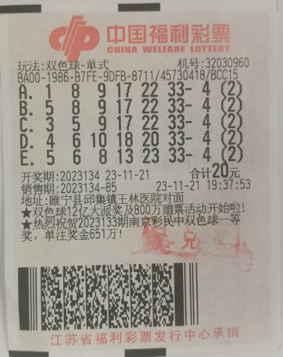 11月21日,中国福利彩票双色球游戏进行第2023134期开奖,这是今年双色球12亿元大派奖活动的第六期派奖。当期双色球红球号码为05、08、09、17、22、33,蓝球号码为04。江苏省徐州幸运彩民顾先生自选了5注号码,各进行了2倍投注,花费20元,收获2注一等奖、4注三等奖、2注五等奖、2注六等奖以及2注一等奖特别奖、2注六等奖翻番奖,总计奖金1333万多元。