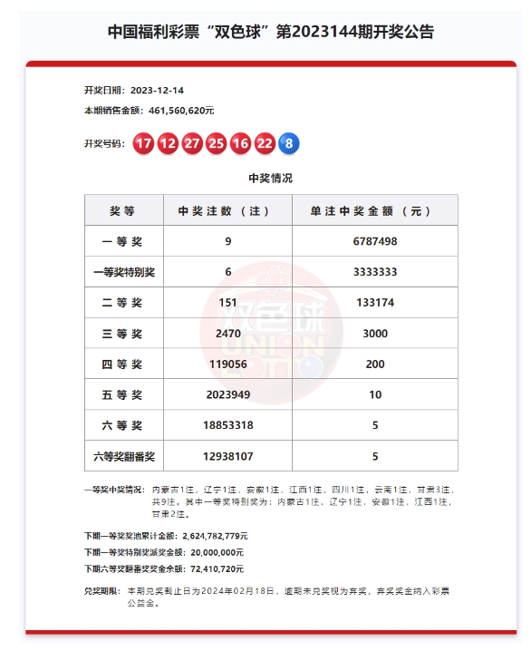 12月14日,福彩双色球第2023144期开奖,同时本期还是双色球12亿大派奖的第16期开奖。本期开奖号码:红球12 16 17 22 25 27,蓝球08。