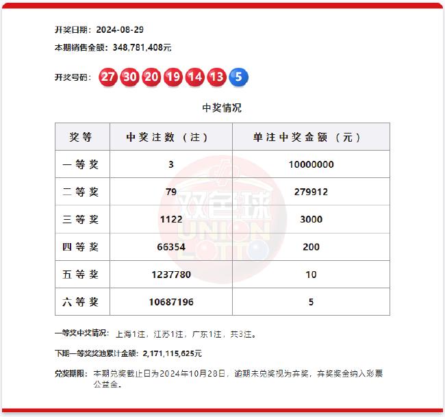 22:13 本期一等奖开出3注,单注奖金1000万元,分落3地。上海、江苏和广东各中出1注。二等奖开出79注27.9万余元。本期双色球全国销量为3.48亿元,计奖结束后奖池余额为21.71亿元。