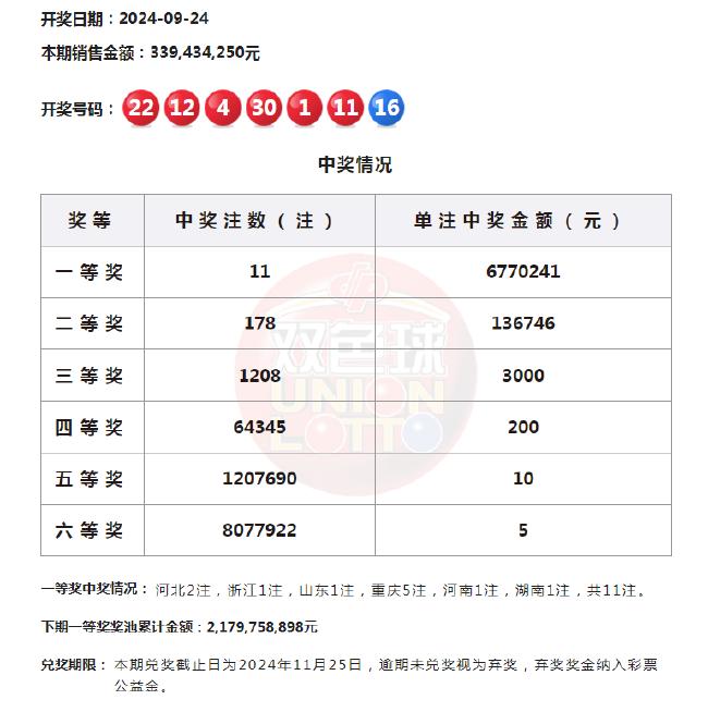 22:12 本期一等奖开出11注,单注奖金677万元分落6地,其中重庆中出5注,或爆3385万大奖;河北中出2注,浙江、山东、河南、湖南各中出1注。二等奖开出178注13.6万余元。本期双色球全国销量为3.39亿元,计奖结束后奖池余额为21.79亿元。