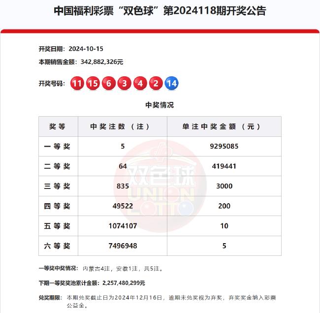 22:08 本期一等奖共开出5注,单注奖金929万余元。5注头奖分落两地,其中内蒙古独揽4注,或爆3718万大奖;余下1注头奖花落安徽。二等奖开出64注41.9万余元。本期双色球全国销量为3.42亿元,计奖结束后奖池余额为22.57亿元。