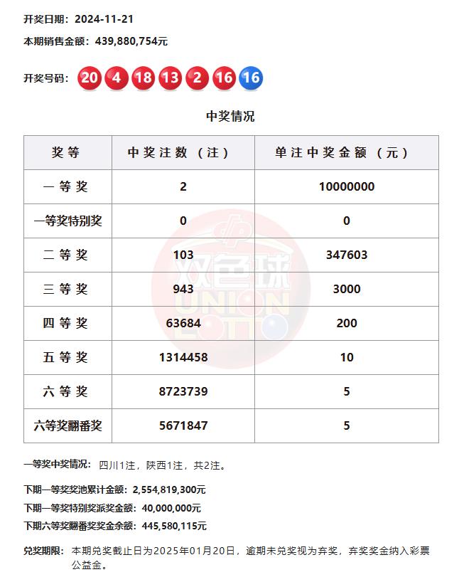 北京时间11月21日,福彩双色球第24134期开奖,同时本期还是双色球12亿大派奖的第9期开奖,当期开奖号码为红球02 04 13 16 18 20,蓝球16。本期一等奖开出2注1000万,无派奖特别奖加奖,2注头奖分落四川、陕西。二等奖开出103注,单注奖金34.7万余元。本期销量4.39亿元,计奖结束后奖池余额25.54亿余元。