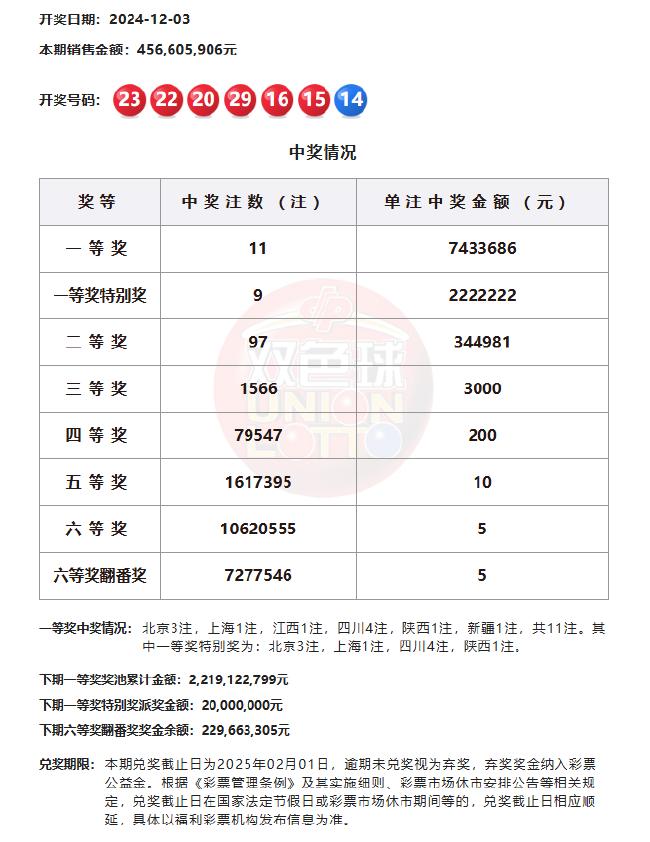 北京时间12月3日,福彩双色球第24139期开奖,同时本期还是双色球12亿大派奖的第14期开奖,当期开奖号码为红球15 16 20 22 23 29,蓝球14。本期一等奖开出11注,单注奖金743万余元,其中9注获得一等奖特别奖加奖222万余元,单注奖金达到965万余元。9注一等奖特别奖分落北京(3注),上海,四川(4注),陕西;2注基本头奖分落江西、新疆。二等奖开出97注,单注奖金34.4万余元。本期双色球销量4.56亿元,计奖结束后,奖池余额22.19亿余元。
