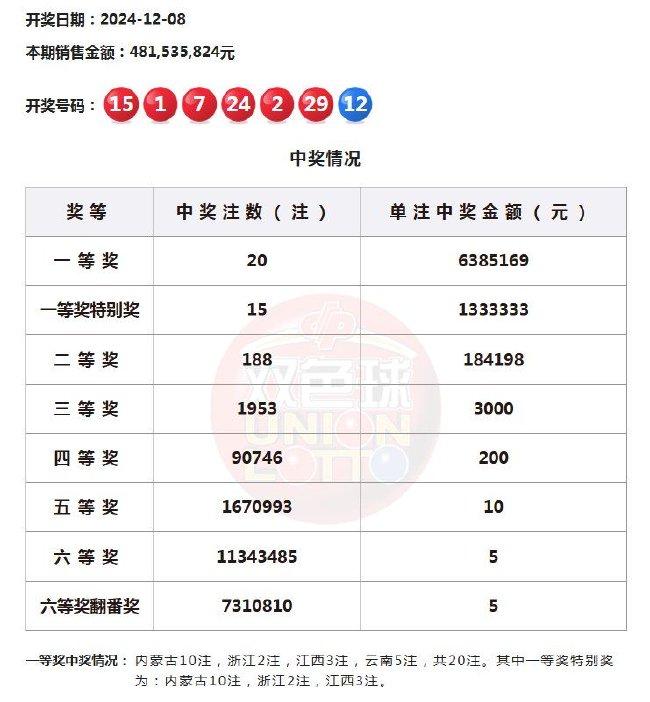 北京时间12月8日,福彩双色球第24141期开奖,同时本期还是双色球12亿大派奖的第16期开奖,当期开奖号码为红球01 02 07 15 24 29,蓝球12。本期一等奖开出20注,单注奖金638万余元,其中15注获得一等奖特别奖加奖133万余元,单注奖金达到771万余元。15注一等奖特别奖分落3地,内蒙古中出10注,或爆7718万巨奖,浙江中出2注,江西中出3注;5注基本头奖均出自云南。