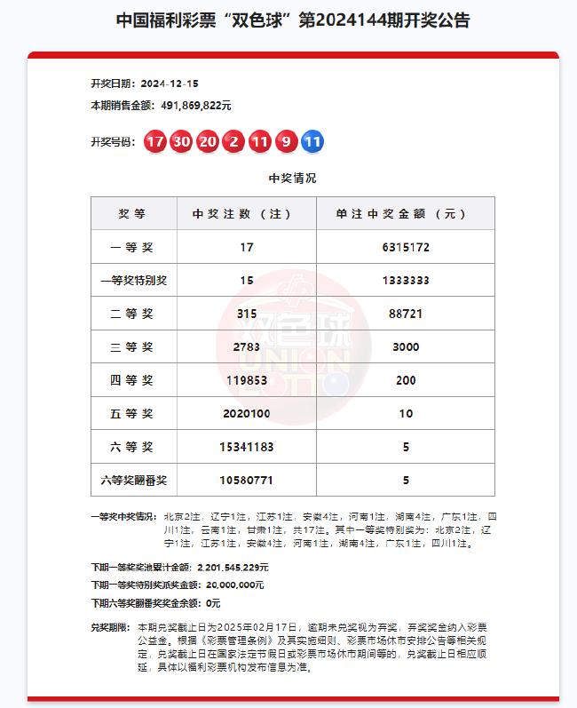 北京时间12月15日,福彩双色球第24144期开奖,同时本期还是双色球12亿大派奖的第19期开奖,当期开奖号码为红球02 09 11 17 20 30,蓝球11。本期一等奖开出17注,单注奖金631万余元,其中15注获得一等奖特别奖加奖133万元,单注奖金达到764万余元。15注一等奖特别奖分落北京(2注)、辽宁、江苏、安徽(4注)、河南、湖南(4注)、广东、四川;2注基本头奖出自云南和甘肃。
