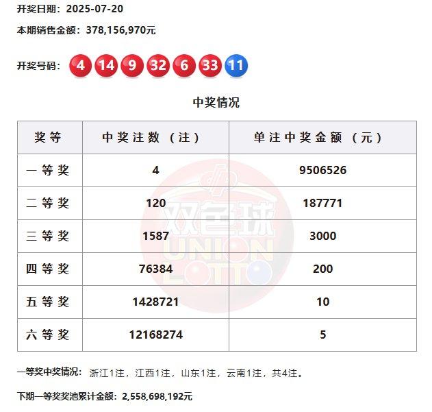 22:05 本期一等奖开出4注,单注奖金950万余元,4注头奖分落4地,其中浙江、江西、山东、云南各1注;二等奖开出120注,单注奖金18.7万余元。本期双色球全国销量为3.78亿余元,计奖结束后奖池余额为25.5亿余元。