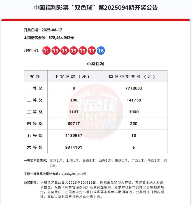 北京时间2025年8月17日,福彩双色球第25094期开奖,以下是详细开奖流程: