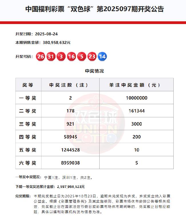 22:05 本期一等奖开出2注,单注奖金1000万元,分落宁夏和深圳。二等奖开出178注,单注奖金16.1万余元。本期双色球全国销量为3.80亿余元,计奖结束后奖池余额为25.97亿余元。