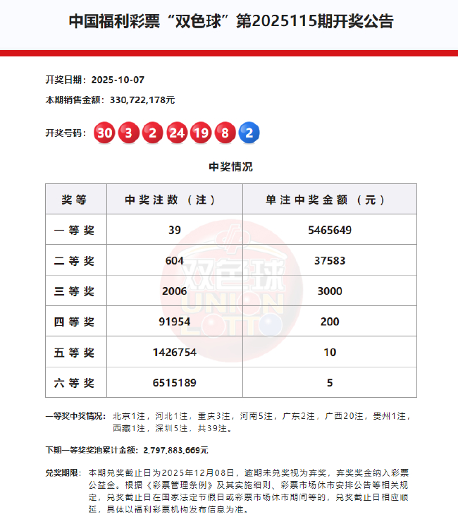 北京时间2025年10月7日,福彩双色球第25115期开奖,当期开奖号码为红球02 03 08 19 24 30,蓝球02。本期双色球井喷39注一等奖,单注奖金546万余元,其中有20注头奖出自广西,若为一人所中,那么该彩民可收获1.09亿的大奖。
