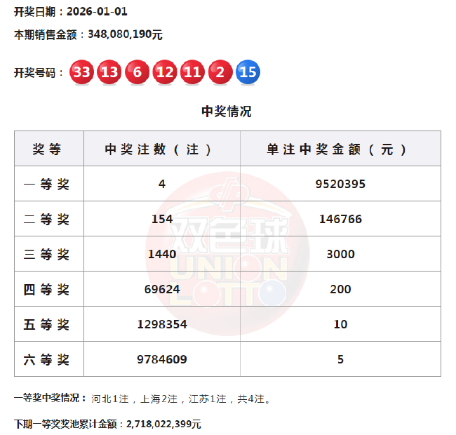 22:10 本期一等奖开出4注,单注奖金952万余元,4注头奖分落3地,其中上海2注,河北、江苏各1注。二等奖开出154注,单注奖金14.6万余元。本期双色球全国销量为3.48亿余元,计奖结束后奖池余额为27.18亿余元。