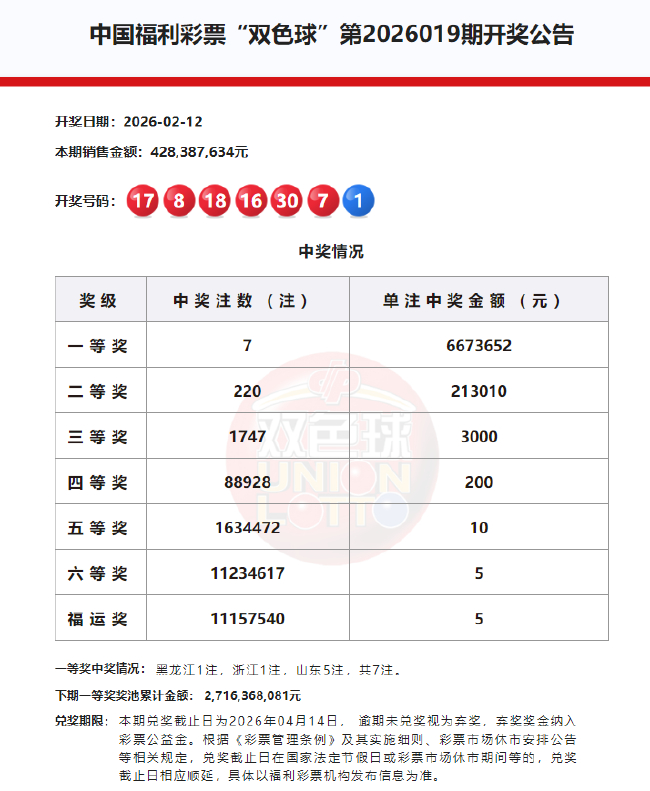 北京时间2026年2月12日,福彩双色球第26019期开奖,当期开奖号码为红球07 08 16 17 18 30,蓝球01。本期一等奖共开出7注,单注奖金667万余元。因开奖前奖池高于15亿,执行特别规定,增设5元福运奖(命中3枚红球即中奖),福运奖开出11157540注。值得一提的是,本期是2026春节休市前最后一期双色球开奖,26020期双色球开奖时间为2月24日21点15分。
