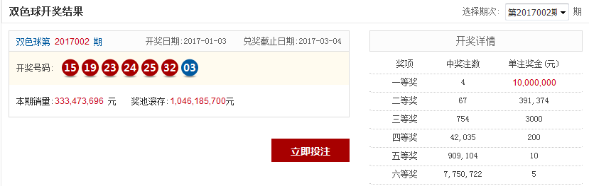 1月3日晚,中国福利彩票双色球游戏进行第2017002期开奖。当期双色球红球号码为15、19、23、24、25、32,蓝球为03。