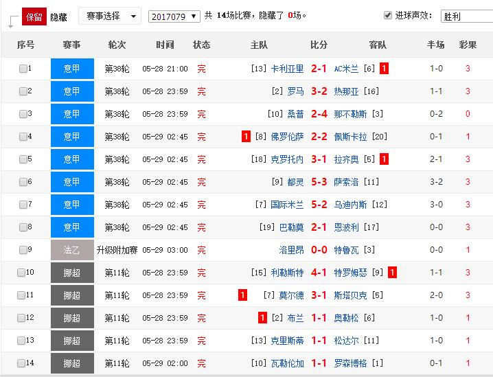 北京时间5.29日凌晨胜负彩17079期结束了全部14场比赛的争夺,其中 ⑴卡利亚里2-1AC米兰 ⑵罗马3-2热那亚 ⑶桑普2-4那不勒斯 ⑷佛罗伦萨2-2佩斯卡拉 ⑸克罗托内3-1拉齐奥 ⑹都灵5-3萨索洛 ⑺国际米兰5-2乌迪内斯 ⑻巴勒莫2-1恩波利 ⑼洛里昂0-0特鲁瓦 ⑽利勒斯特4-1特罗姆瑟 ⑾莫尔德3-1斯塔贝克 ⑿布兰1-1奥勒松 ⒀克里斯蒂1-1松达尔 ⒁瓦勒伦加1-1罗森博格 彩果:33013333133111 本期胜负彩销量:21,455,602元,任选九销量:13,548,936元。具体情况如下: