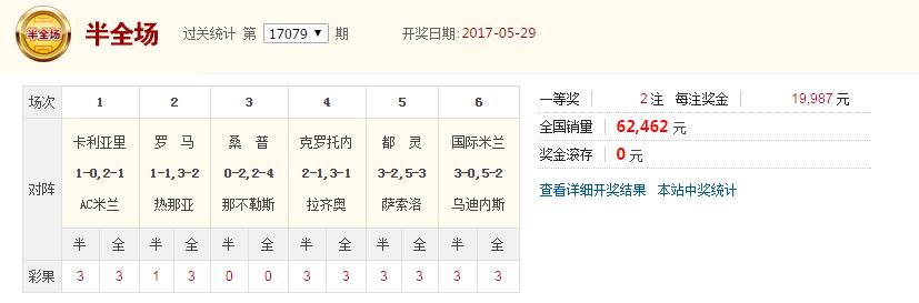 17079期6场半全场一等奖2注,单注奖金:19987元,本期销量:62462元。奖池滚存:0元。彩果:331300333333。