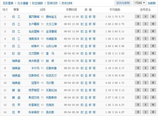 胜负彩17080期主要由日乙、瑞典超、挪超和巴甲赛事组成,此外还有一场