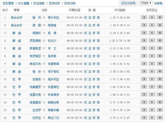 胜负彩17089期主要由挪超、巴甲和联合会杯组成。从盘口分布来看,一球以上的深盘共有3场,智利、德国和罗森博都是稳胜之局。而半/一盘面多达4场,总体来说难度偏低。其余平/半和平手各三场,难点比赛皆汇聚于此。冷门方面,需要留意巴甲巴拉竞和圣保罗输球的情况,其他比赛相对正路,预计奖金维持中低水平。