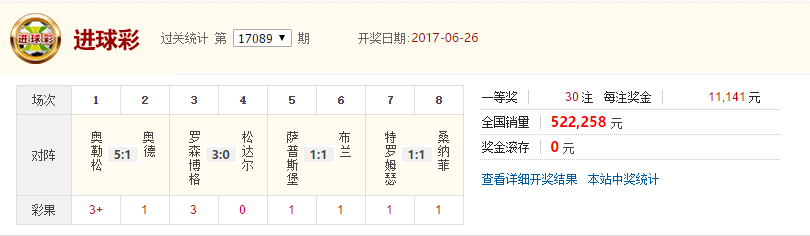 17089期4场进球一等奖30注,单注奖金:11141元, 本期销量:522258 元,奖池滚存:0元。 彩果:31301111。