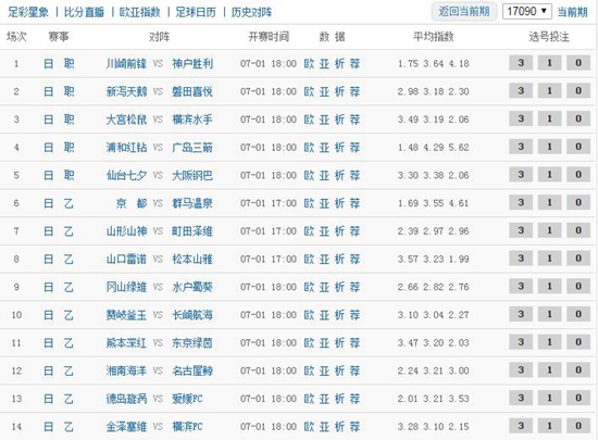 胜负彩17090期主要由日职和日乙联赛组成,传统强队浦和红钻和广岛三箭近期状态都不好,尤其是广岛多轮不胜沦入降级区,本场落魄豪门内战值得关注。从盘口分布来看,一球以上的深盘只有上述这场比赛,半球到半/一之间共有3场,平手到平/半也有3场,而受让平/半盘多达7场比赛,总体来说竞猜难度偏高。