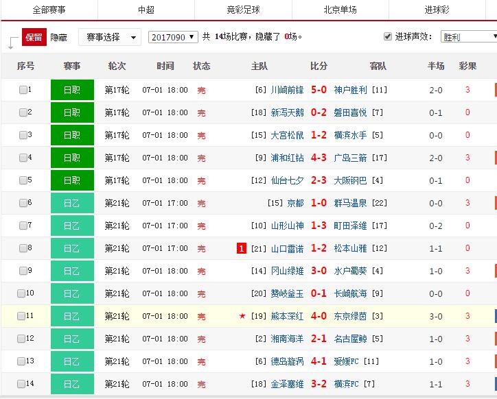 2017年7月1日晚,胜负彩17090期14场比赛全部完赛,详情如下:【胜负彩】17090期赛果:川崎前锋5-0神户胜利 【日职联】 ⑴川崎前锋 5-0 神户胜利 ⑵新泻天鹅 0-2 磐田喜悦 ⑶大宫松鼠 1-2 横滨水手 ⑷浦和红钻 4-3 广岛三箭 ⑸仙台七夕 2-3 大阪钢巴 【日乙】 ⑹京都 1-0 群马温泉 ⑺山形山神 1-3 町田泽维 ⑻山口雷诺 1-2 松本山雅 ⑼冈山绿雉 3-0 水户蜀葵 ⑽赞岐釜玉 0-1 长崎航海 ⑾熊本深红 4-0 东京绿茵 ⑿湘南海洋 2-1 名古屋鲸 ⒀德岛漩涡 4-1 爱媛FC ⒁金泽塞维 3-2 横滨FC 彩果:30030300303333 本期胜负彩销量:17,200,300元,任选九销量:11,150,464元。