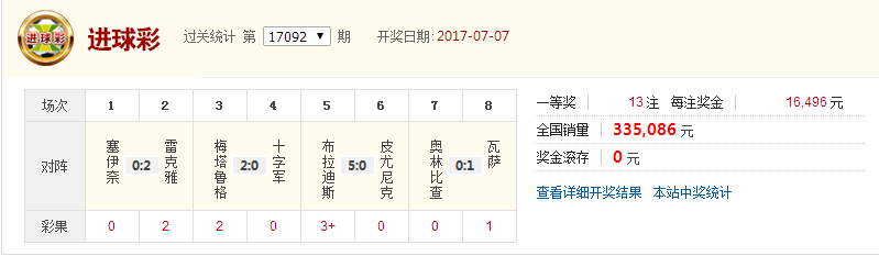 17092期4场进球一等奖13注,单注奖金:16496元,本期销量:335086元,奖池滚存:0元。彩果:02203001。