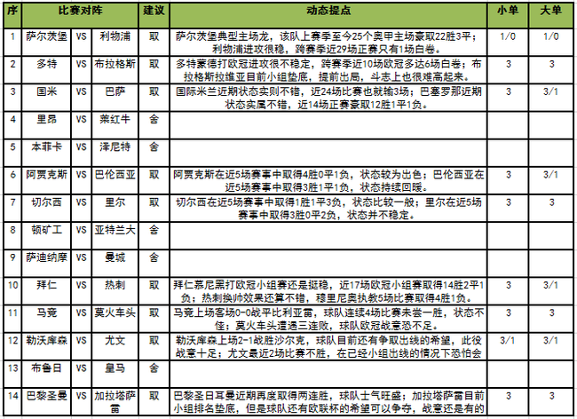 本期任九在14场欧冠小组赛的基础上舍弃了几场浅盘的比赛:里昂近期的比赛涨球明显,近10场正赛9场至少2球,本场主场面对近期的比赛零封能力偏差,近27场各项赛事只有5场实现零封的莱红牛,机构仅仅给出平手盘,对于两队都没有倾向性,本场舍弃。