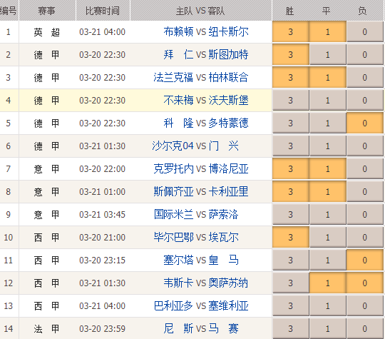 1 英超 03-21 04:00 布赖顿 VS 纽卡斯 参考:31