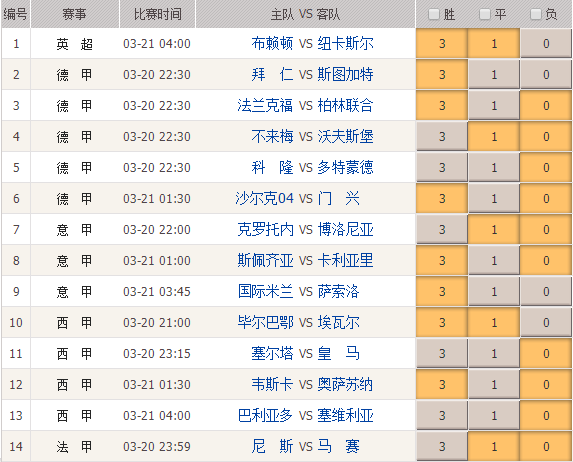 21030期胜负彩14场:本周末联赛之后,下赛周将是国际比赛周,各洲进行世预赛小组赛。周中欧冠杯和欧罗巴1/8赛次回合全部结束,并抽签产生了1/4赛的具体对阵。无论晋级与否,回到联赛还得全力以赴,尤其是国内外赛事连轴转的多线作战球队,需关注轮换和伤停。本期胜负彩基本面上强弱对阵较多,会有五至七场欧指支持亚指0.75球以上让步,其间不乏牌面虚高场次,选胆时还得谨慎甄别。本期由彩店地图店主慧百竞彩为大家带来心水推荐,要上车的彩友扫描文末二维码,加店主微信交流!