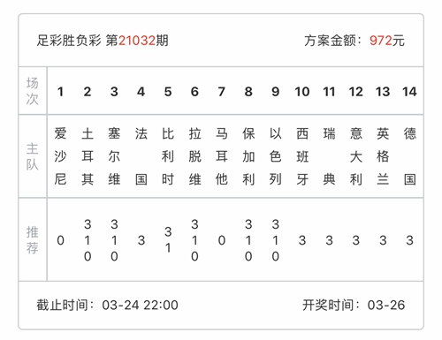 21032胜负彩14场比赛全部为世界杯欧洲区预选赛。法国作为传统强队,实力不用多讲,两队近与乌克兰几次交手大多能大胜,而归本场主场出战天时地利人和都有,一场大胜欲呼而出;另外西班牙、意大利、英格兰、德国等对手实力相差太多,主胜均可做稳胆。本期由彩店地图店主慧百竞彩为大家带来心水推荐,要上车的彩友扫描文末二维码,加店主微信交流!
