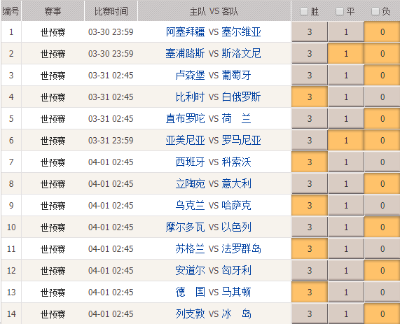 胜负彩第034期仍然全部是世欧预赛事,从对阵来看还是很难出现大冷,毕竟预选赛弱队太多,如果没有爆冷很难奖金很高,例如卢森堡对阵葡萄牙,直布罗陀对阵荷兰的比赛,虽然都是主场作战,但两队很难给传统世界劲率带来什么真正的麻烦。