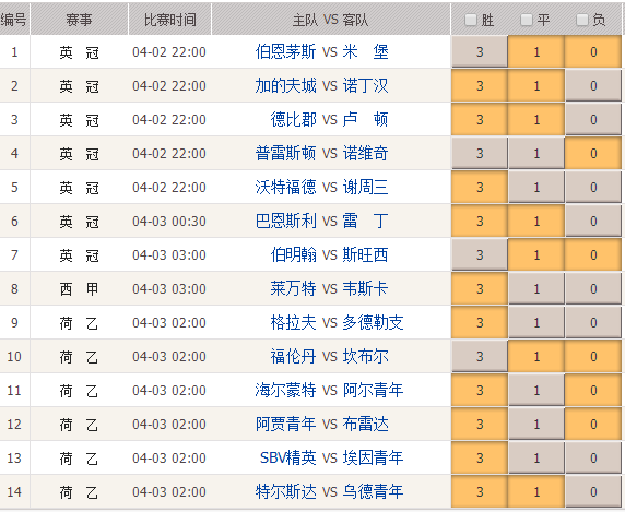034期足彩头奖开出133注,单注奖金94763元。本期胜负彩14场比赛主要由英冠和荷乙场次组成,其中英冠7场,荷乙6场,此外还有一场西甲场次。下面我们就本期的足彩比赛做出分析。