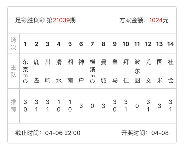21039胜负彩14场比赛由7场日职、4场欧冠、2场意甲和1场西甲组成。日职除了神户和横滨以外,其他球队的比赛均须多防;欧冠主场出战的曼城应该是志在必得,主胜是最佳之选;意甲方面,对于榜首的国米,现在一心一意面对联赛,绝不会错过本轮主场抢分的机会。本期由彩店地图店主慧百竞彩为大家带来心水推荐,要上车的彩友扫描文末二维码,加店主微信交流!
