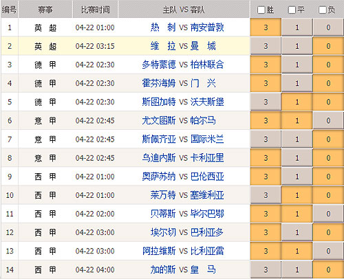 周中胜负彩第21044期以英超、德甲、意甲和西甲组成。其中,英超、意甲领头羊曼城和国际米兰纷纷作客,挑战阿斯顿维拉和斯佩齐亚,对手实力都不是很强,对于两大联赛领头羊来说,进一步扩大积分领先优势是势在必行。德甲方面,多特蒙德将为欧冠席位做最后一搏,而西甲的皇马也将尽全力追赶马竞。